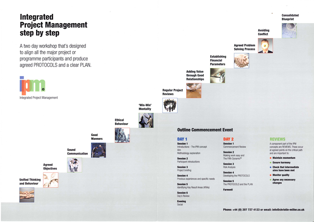 Christie Millier has developed a unique and special method of pulling together all or most elements of a project. These include the people issues the commercial objectives, the finances and the PROTOCOLS which support and enhance total Critical Path Management. Due attention is paid to Defined Quality Management© (DQM) and the acknowledgement by all concerned of the core values, philosophy and actions required to ensure success.
